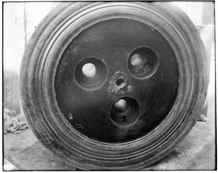 Long Beach Steam Station (misc.) - A close-up view of the step-bearing for the steam turbo generator at the Long Beach Steam Plant.