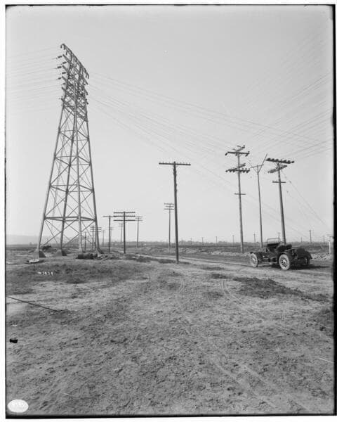 A1.2 - Accidents - The intersection of Anaheim and Dominguez Streets north of Long Beach Harbor. [View looks southwest towards San Pedro and shows steel transmission tower. It is the scene of an accident to a lineman.]