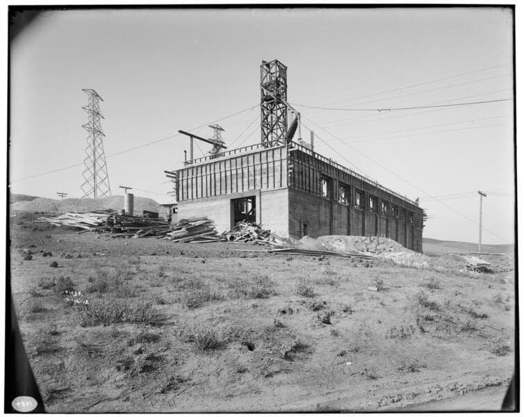 Newmark Substation - Construction of station building, showing transmission towers (the Colton-Los Angeles 66 kV, #3 Line).