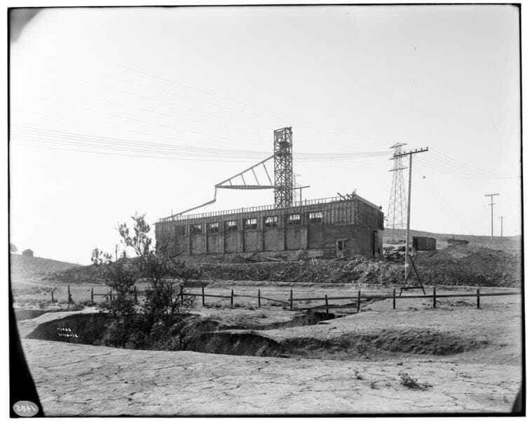 Newmark Substation - Construction of station building, showing transmission towers (the Colton-Los Angeles 66 kV, #3 Line).