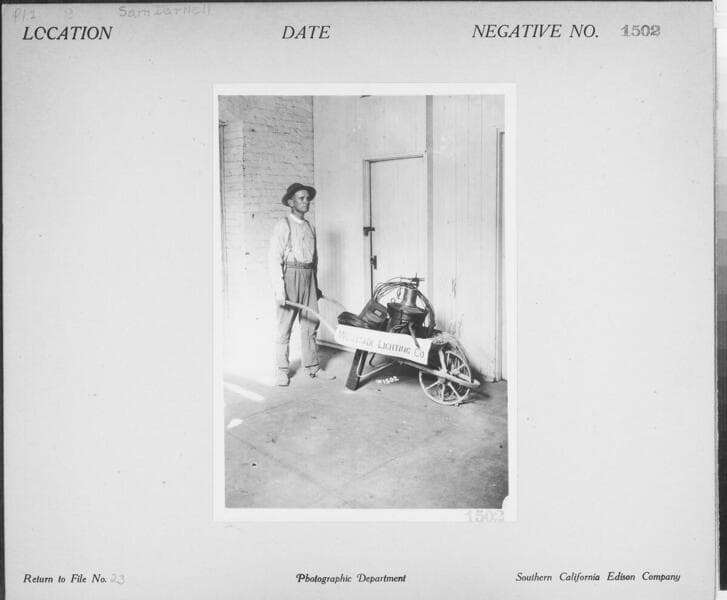 P1.2 - Portraits, misc. - Sam Darnell, Westside Lighting Company's first lineman, demonstrating how equipment was moved in wheelborros in 1897, before WLC evolved into Southern California Edison Company.