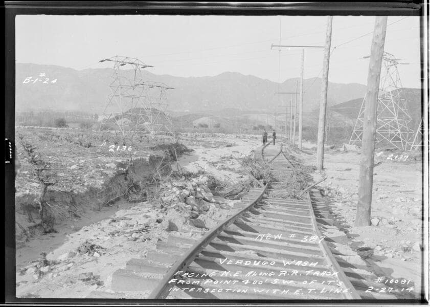 Big Creek Transmission line towers - Showing conditions in Verdugo Wash after heavy rains. Taken from a point 100' North of West Tower #2134 - (Mile 236 - Tower 7).