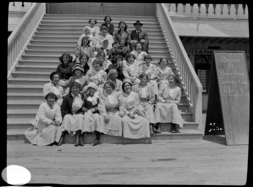 A group portrait of a group of young women sitting on the steps at the Balboa Pavilion