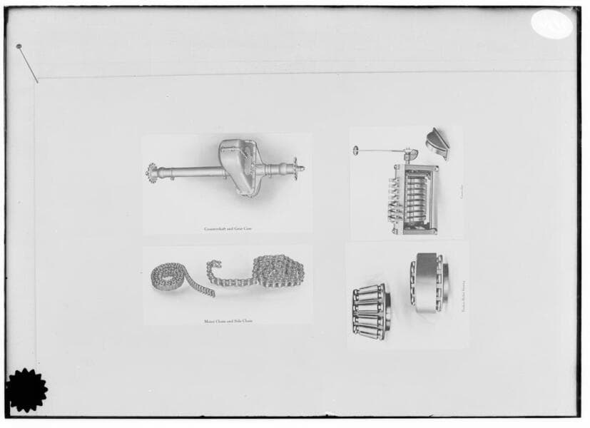 T3.1 Transportation - Autos, Trucks, & Railcars - Slide Negative - Autos and parts. [Detail views of the front axle, rear wheel, and motor bearing.]