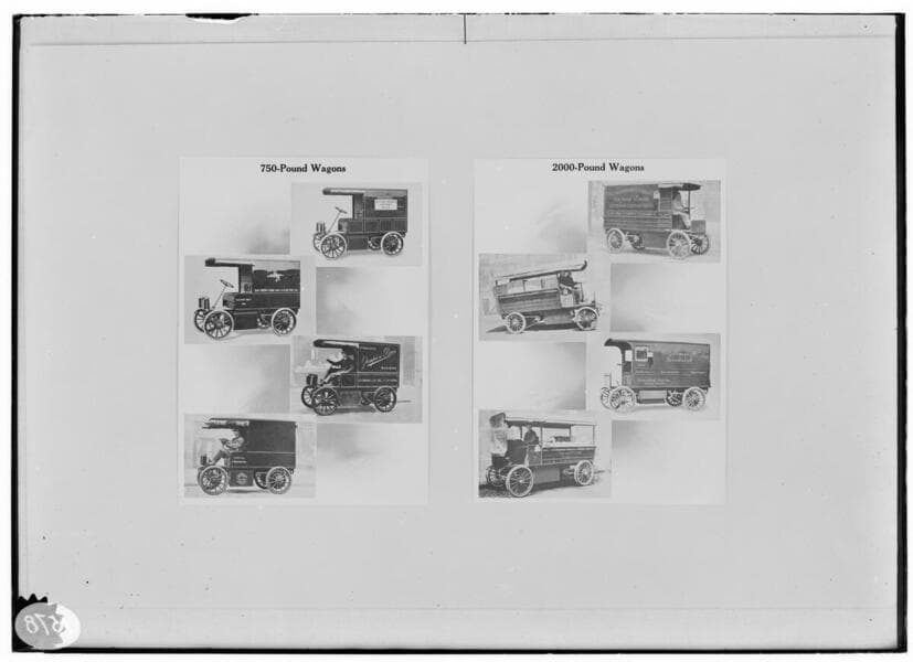 T3.1 Transportation - Autos, Trucks, & Railcars - Slide Negative - Autos and parts. [Two posters showing trucks, one showing 1000 pound wagons, and the other featuring 3 1/2 ton trucks.]