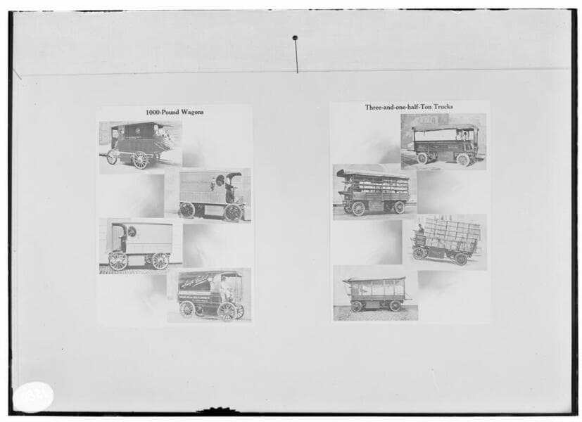 T3.1 Transportation - Autos, Trucks, & Railcars - Slide Negative - Autos and parts. [Two posters of trucks, one of 750 pound wagons, and the other of 2000 pound wagons. Many of the trucks have drivers.]