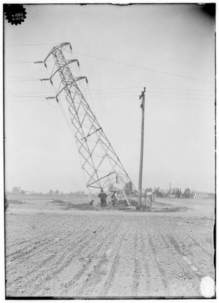 A1.4 - Natural Disasters - A line crew examining the damage to transmission Tower #63 along the Long Beach to Colton Transmission Line, showing the tilt.