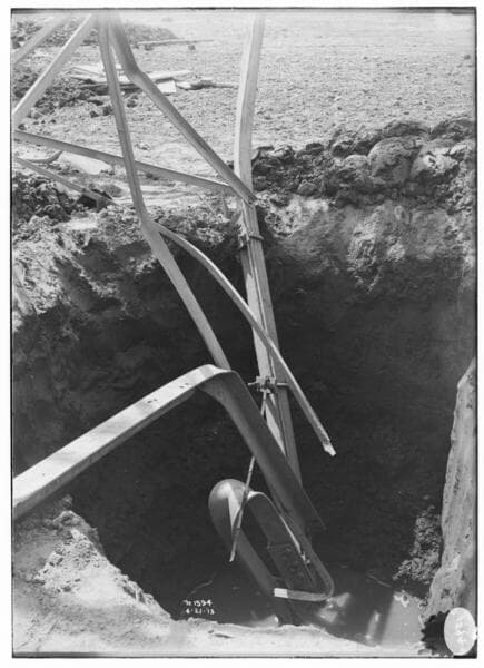 A1.4 - Natural Disasters - A line crew examining the damage to transmission Tower #63 along the Long Beach to Colton Transmission Line, showing the tilt.