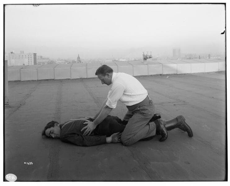 A1.7 - "Safety First" - Artificial respiration, second position. [Two men conducting a first aid demonstration. They appear to be on the roof of the General Office].