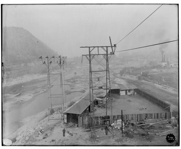 A1.4 - Natural Disasters - Kern River transmission Tower change at Los Angeles Stockade, showing the Agricultural Park building in the background.