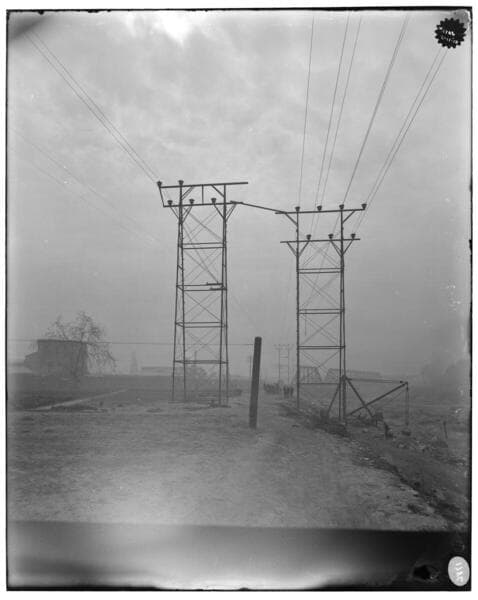 A1.4 - Natural Disasters - Kern River transmission Tower change at Los Angeles Stockade, showing the Agricultural Park building in the background.