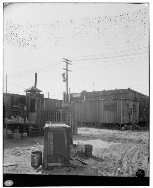 Ocean Park Substation - Reconstructing the Electric Distribution System. [showing tight placement of distribution poles down alley]