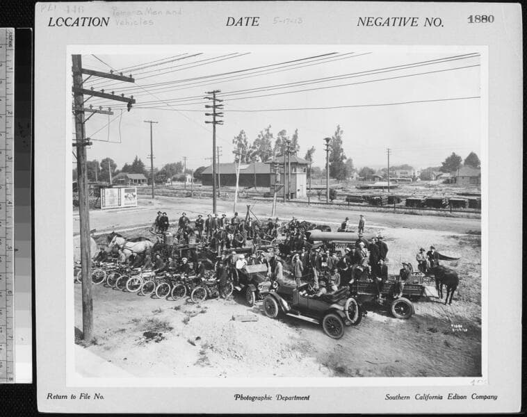 P1.1 - Group Portraits - Pasadena Electric Distribution System Gang and their vehicles [automobiles and horse-drawn wagons.]