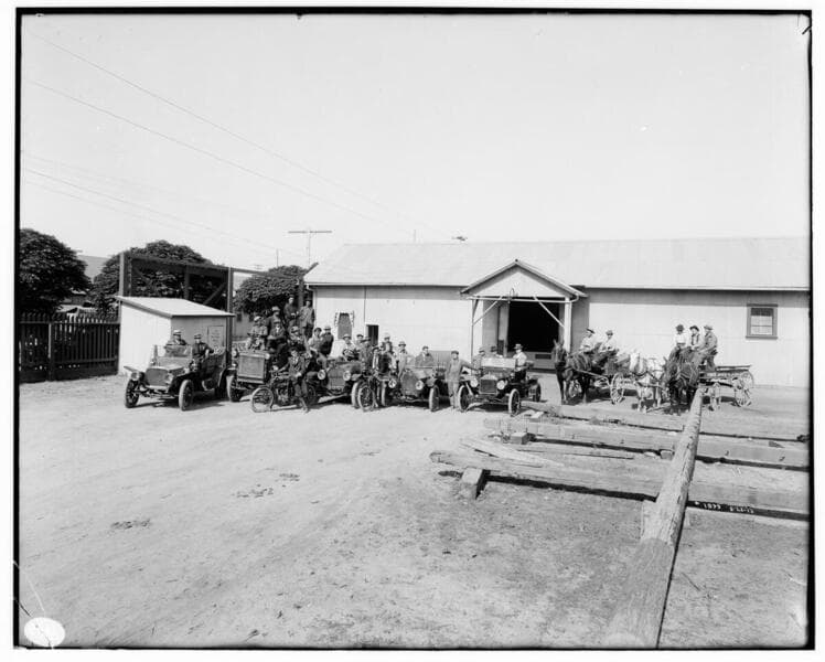 P1.1 - Group Portraits - Pasadena Electric Distribution System Gang and their vehicles [automobiles and horse-drawn wagons.]