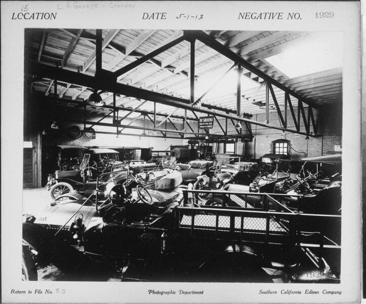 Miscellaneous Facilities - Los Angeles - The crowded Los Angeles Garage, showing SCE automobiles and trucks and employees.