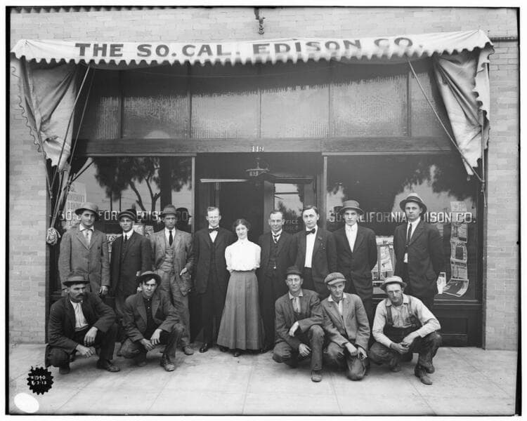 P1.1 - Group Portraits - Appliance Solicitors. [A group portrait of four appliance salesmen standing outside a SCE local office. Not long after the Appliance Department was established in 1910.]