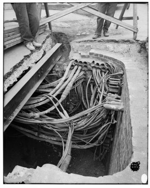 Distribution, Underground - Manhole at 4th and Alley showing underground cables & Sam Darnell, [Edison's Superintendent of Distribution] in hole.
