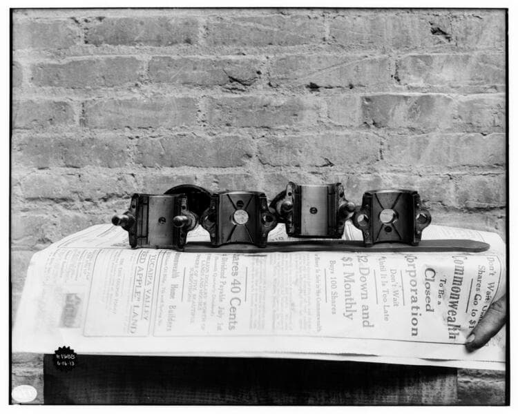 T3.1 Transportation - Autos, Trucks, & Railcars - The spark plugs out of a 2 1/2 ton truck. [The label reads: Edison-2 1/2-Ton Truck No. 79 - In Service 6 Months-9-Days-Run 7829 Miles-First Time Out Of Cylinder.