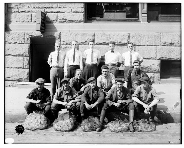 P1.1 - Group Portraits - Before World War One, Edison customer services included free replacement of burned-out light bulbs by the delivery boys of the Lamp Department. This service was important in the days prior to the wide-spread use of the modern standard screw base light bulb.