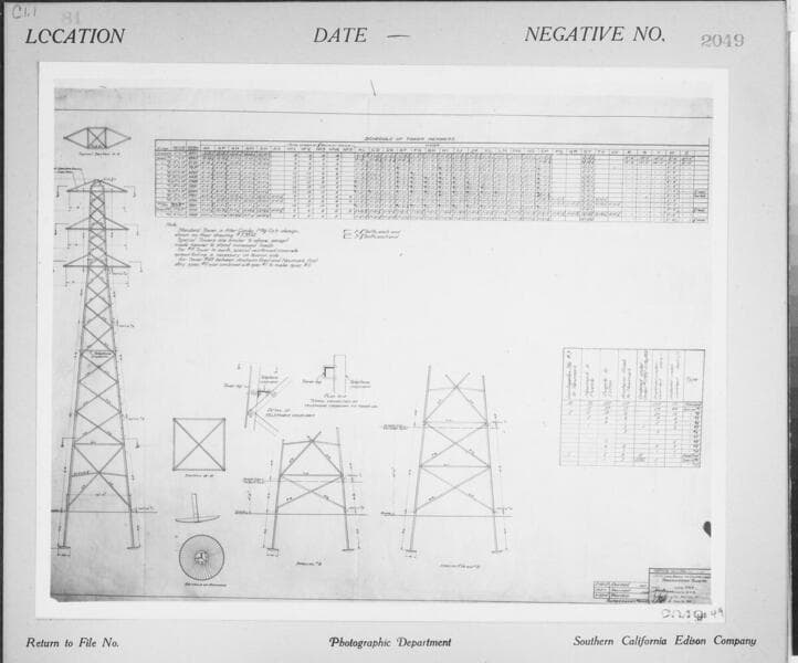 C1.1 - Charts miscellaneous - Edison drawing #4508 (originally) - A drawing of the Long Beach to Colton tower top (66 KV line) with grounding arms-railroad crossing tower by Jim Lighthipe and H.W. Dennis.