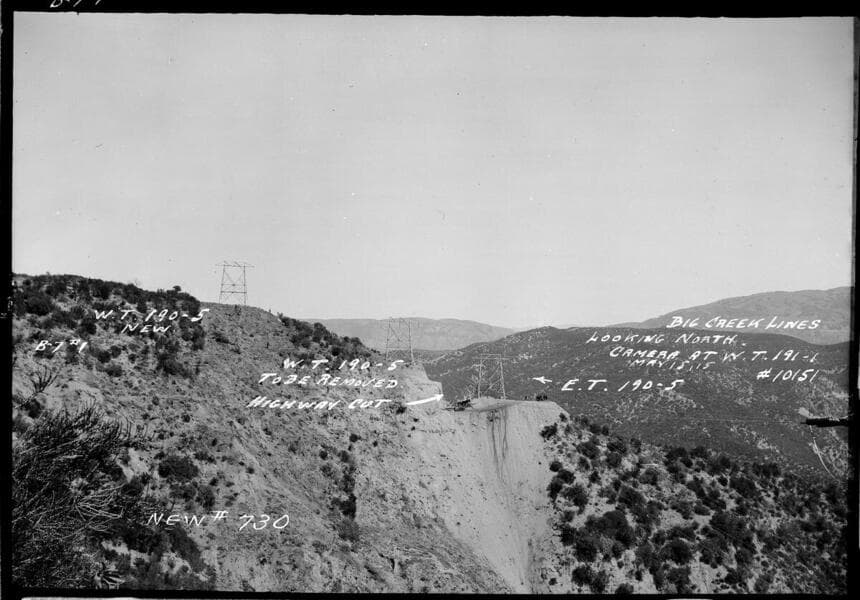 Big Creek T/L Towers - Looking North from new West Line Mile 190 - Tower 5. Extra Tower - Mile 190 - Tower 4.5 in foreground. Relocation of line because of highway cut.