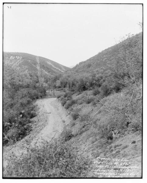 Big Creek T/L right-of-way - Taken in connection with Tejon Ranch condemnation suit. Looking South from point opposite Mile 176, Tower 6, showing telephone line, also road in Lebec Flats.