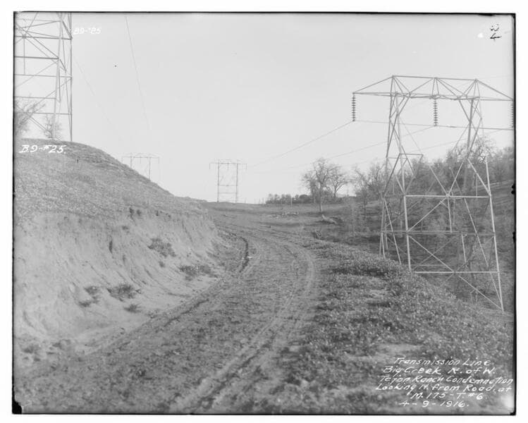 Big Creek T/L right-of-way - Taken in connection with Tejon Ranch condemnation suit. Looking North from point opposite Mile 175, Tower 4, showing transmission line, telephone, and road.