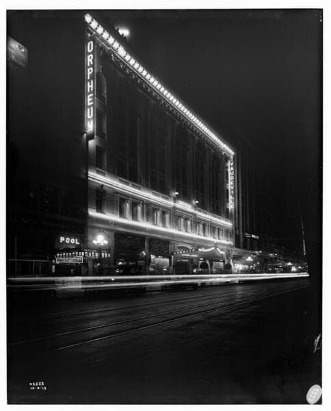 L1.3 - Lighting, stores - Night photo of Quinn's Superba Theatre, Clune's Theater, and the Pantages with "Vaudeville" in lights. Lights blurr from automobiles zooming by.