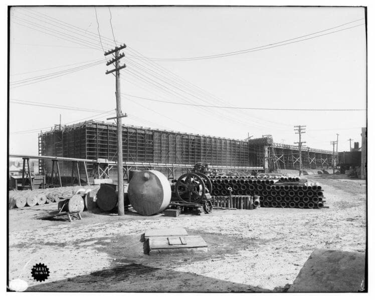 Los Angeles #3 Steam Plant while under construction, specifically showing the construction of the cooling tower reservoir.