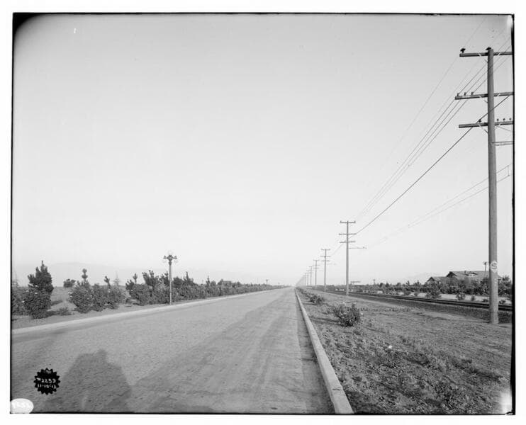 L1.2 - Lighting, streets - Area view of a street in Torrance, showing an ornamental streetlight posts. [There is a fire hydrant/drinking fountain in the foreground.]
