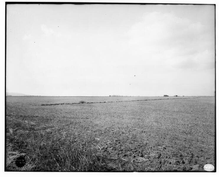 View of an empty landscape, showing open land with soil and hills.