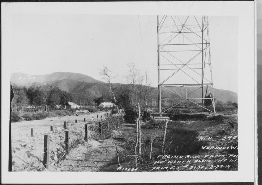 Big Creek Transmission line towers - View in Verdugo Wash taken from a point 100' Northwest from West angle tower #2133 Mile 236 - Tower 6, lookin South showing conditions after heavy rains.
