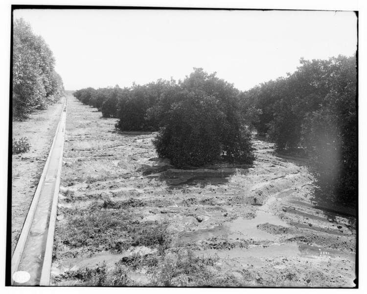 Image of a man in an orange grove in Riverside, California, tilling the soil next to a concrete irrigation ditch with water.