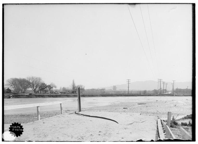 Long Beach-Lighthipe-Laguna Bell Transmission Line - At the crossing Rio Hondo near Pico, showing storm damage from the storm of February 20th. [There is an A-frame transmission tower on the bridge].