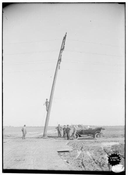 A1.4 - Natural Disasters - A repair crew working on the temporary transmission line on Main Street near the Los Angeles Brewery.