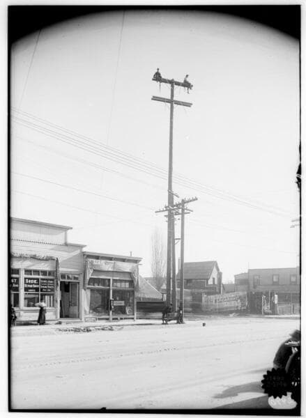A1.4 - Natural Disasters - A repair crew working on the temporary transmission line on Main Street near the Los Angeles Brewery.