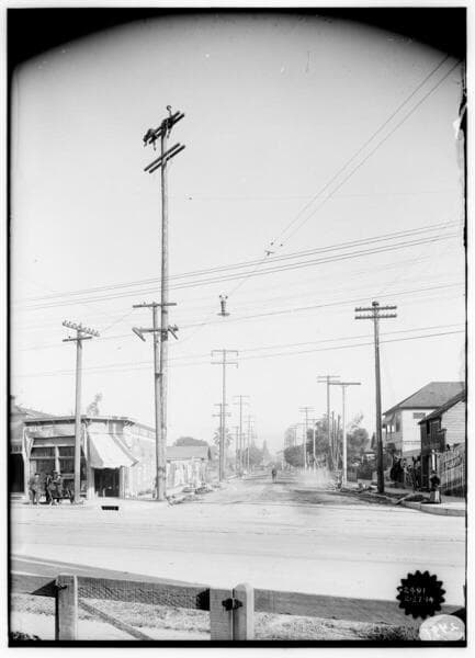 A1.4 - Natural Disasters - A repair crew working on the temporary transmission line on Main Street near the Los Angeles Brewery.