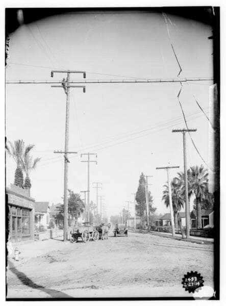 A1.4 - Natural Disasters - Men with an auto on Avenue 19 looking Southwest, showing temporary transmission lines due to the storm of February 20th.