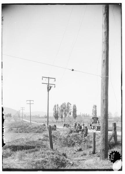 A1.4 - Natural Disasters - Men with an auto on Avenue 19 looking north, showing temporary transmission lines due to the storm of February 20th.