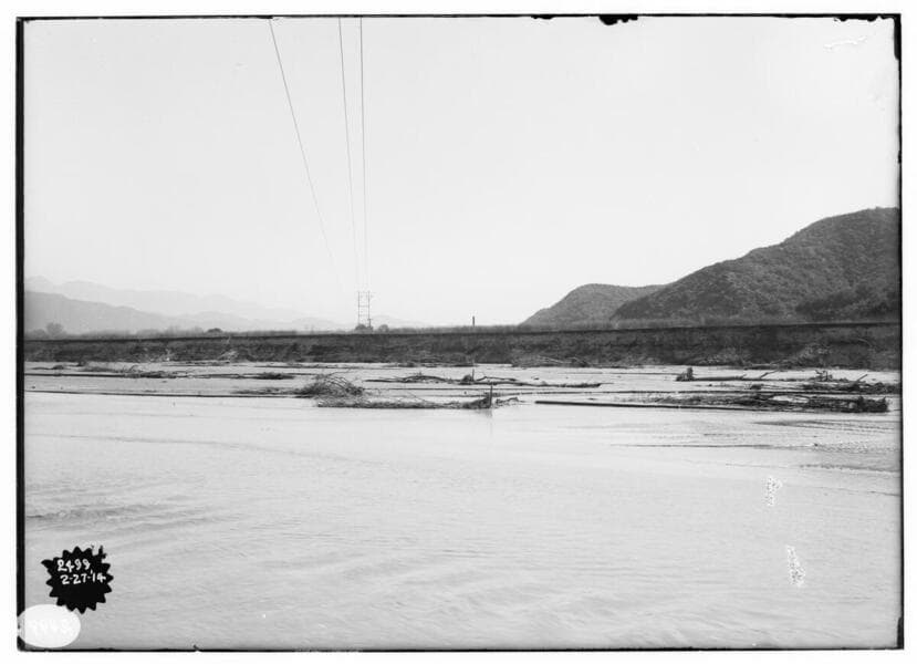 A1.4 - Natural Disasters - An abandoned Kern River Transmission Line Tower in the Los Angeles River near Tropico, which is now Glendale. The tower was abandoned due to damage from the storm of February 20th. The tower is leaning.