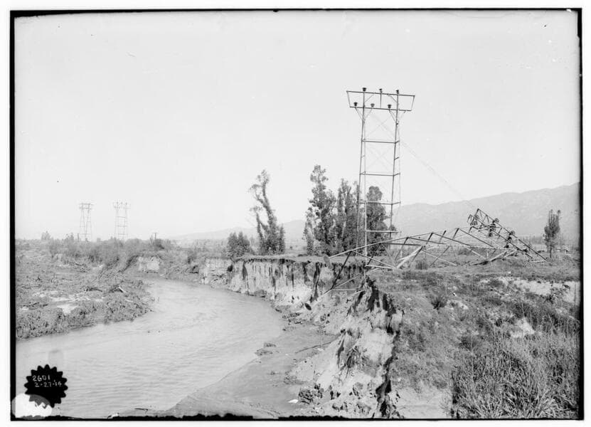 A1.4 - Natural Disasters - A fallen transmission tower in the river along the Kern River Transmission Line as a result of the storm of February 20, 1914.