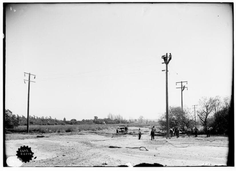 Long Beach-Lighthipe-Laguna Bell Transmission Line - A repair crew working on a weak pole on the temporary line below Vinvale on the Long Beach Transmission Line. The damage was caused by the storm of February 20th.