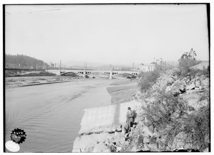 A1.4 - Natural Disasters - An abandoned Kern River Transmission Line Tower in the Los Angeles River near Tropico, which is now Glendale. The tower was abandoned due to damage from the storm of February 20th. The tower is leaning.