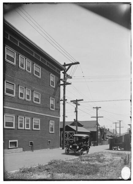 Distribution Lines - Pole line construction in alley, Slauson & Figueroa.