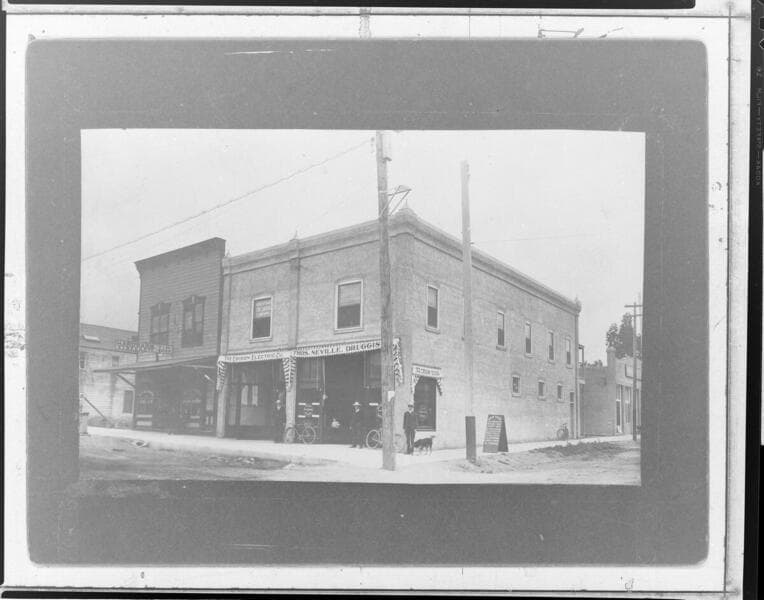 Four people standing in front of the Edison Electric Company's Pasadena Local Office, [showing a drugstore on the right with bicycles in front.]