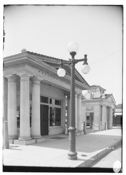 L1.2 - Lighting, streets - An ornamental lighting post at The Pike in Long Beach, [showing an ice cream parlor, "Wigwam", and the Fairyland Theatre.]