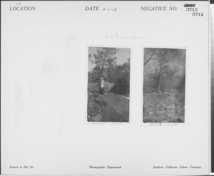 Kern River No. 3 - Washout, Raymaker Camp, 2 miles above hospital. [plus four shots: Road & dump 21-22 (#03716), near view of 500' wash (#03717), 200' below hospital (#03718), & 1/4 mile below Camp #3 (#03719) on same photocard.]
