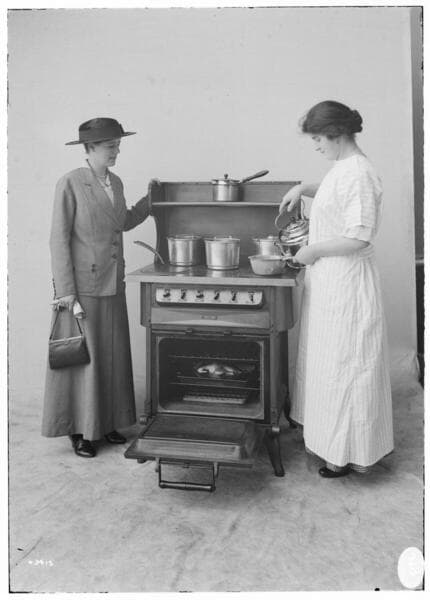 A3.3 - Ranges - Two women posing by an Electric Range with the oven on top.