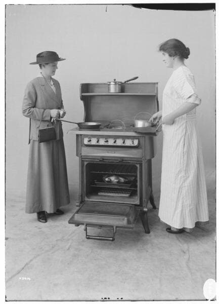 A3.3 - Ranges - Two women posing by an Electric Range with the oven on top.