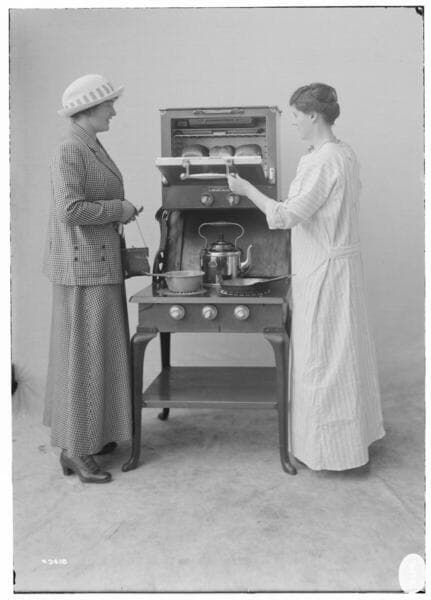 A3.3 - Ranges - Two women posing by an Electric Range with the oven on top.